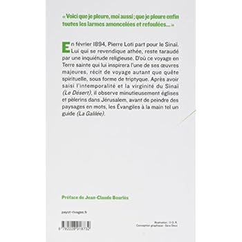 Février 1894. Pierre Loti part pour le Sinaï. Ce voyage en Terre Sainte nourrira l'inquiétude religieuse de cet "agnostique qui ne se résigna jamais à renoncer à Dieu", et lui inspirera l'une de ses oeuvres majeures, récit de voyage autant que quête spirituelle sous forme de triptyque : après avoir saisi l'intemporalité et la virginité du Sinaï (Le Désert), il observe minutieusement églises et pèlerins dans Jérusalem, avant de peindre des paysages en mots, les Évangiles à la main tel un guide (La Galilée).