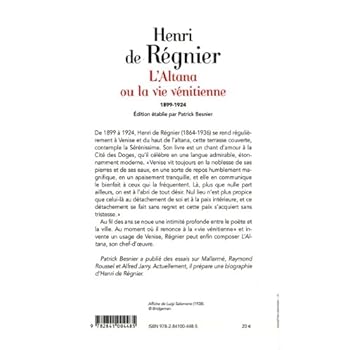 • Réédition d'un grand classique sur Venise dans une nouvelle version.• Les livres sur Venise rencontrent toujours leur public.L'Altana ou la vie vénitienne a paru pour la première fois en 1928. Il s'agit d'un recueil d'impressions de voyages et de séjours à Venise entre 1898 et 1924. Henri de Régnier avait pris l'habitude de se rendre à Venise tous les ans ou tous les deux ans. Sa connaissance intime de la ville s'exprime à travers ces pages, où le poète d'habitude distant et préoccupé d'idées abstraites livre là des considérations sur la vie quotidienne dans la Cité des doges. Il est vrai que Venise a la particularité de tout transfigurer y compris les détails de la vie de tous les jours. L'altana est une sorte de belvédère en bois, muni d'une rampe, installé sur le toit des palais vénitiens. C'est pour Régnier un symbole de cette vie vénitienne, où accoudé à une rampe il se livre à une méditation sur les secrets de cette ville, son silence et sa beauté. Régnier fait part de ses visites aux plus belles demeures de Venise et raconte ses souvenirs de rencontres avec d'autres habitués de la Sérénissime, comme Jean-Louis Vaudoyer, Edmond Jaloux ou Madame Bulteau. Tellement épris de Venise, Régnier ne pouvait s'empêcher de repenser à Venise lorsqu'il était à Paris, et consacre un chapitre entier à Venise chez soi, où il n'écrivait qu'avec de l'encre ramené de son premier séjour là-bas. Ce livre est d'une grande fraîcheur et ne manquera pas de passionner les amateurs de Venise. D'ailleurs un connaisseur aussi avisé que Philippe Sollers ne s'y est pas trompé dans son Dictionnaire amoureux de Venise puisqu'il consacre une notice plutôt élogieuse à Régnier : " Il ne faut pas sous-estimer Régnier, ce n'est pas si mal. ".