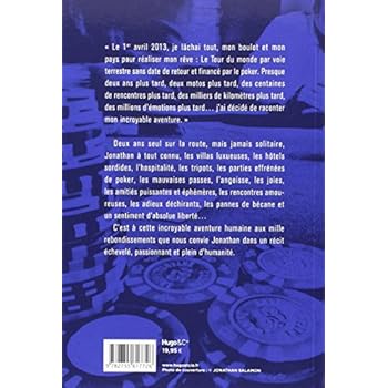 Le récit épique et passionnant d'un joueur de poker itinérant. Le Blog de l'auteur, World Poker Trip.net a déjà plus de 200 000 visites ! " Le 1er avril 2013, je lâchais tout, mon boulot et mon pays pour réaliser mon rêve : Le Tour du Monde par voie terrestre sans date de retour et financé par le poker. Presque deux ans plus tard, deux motos plus tard, des centaines de rencontres plus tard, des milliers de kilomètres plus tard, des millions d'émotions plus tard... J'ai décidé de raconter mon incroyable aventure. " Deux ans seul sur la route, mais jamais solitaire, Jonathan a tout connu, les villas luxueuses, les hôtels sordides, l'hospitalité, les tripots, les parties effrénées de poker, les mauvaises passes, l'angoisse, les joies, les amitiés puissantes et éphémères, les rencontres amoureuses, les adieux déchirants, les pannes de bécane et un sentiment d'absolue liberté ... C'est à cette incroyable aventure humaine aux mille rebondissements à laquelle nous convie Jonathan dans un récit échevelé, passionnant et plein d'humanité.