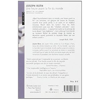 " Quel fourmillement dans ce monde, une heure avant sa fin ! Les ministres, ces garçons de course de l'Europe, courent d'un poste perdu à un autre et un malheur nouveau fleurit dans les ruines ! Tous les États entretiennent avec eux des "relations amicales". Leurs relations amicales [...] reposent en outre sur le principe de la soi-disant "non-ingérence", c'est-à-dire qu'il est interdit au locataire Müller du premier étage de monter au deuxième quand justement le locataire Meier bat son enfant à mort. " Joseph Roth, 1934